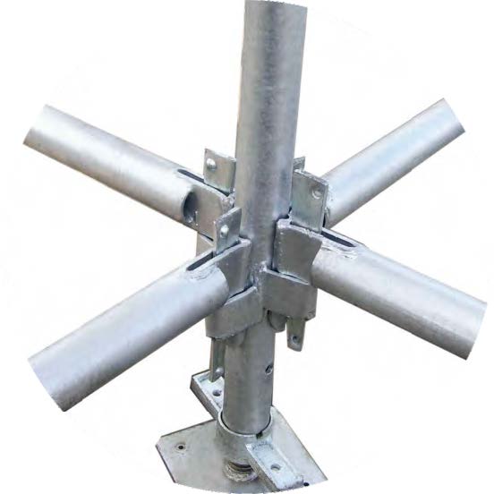 每套圓盤式腳手架系統(tǒng)包含立桿、橫桿、斜拉、連接基座、圓盤三腳架、踏板等。